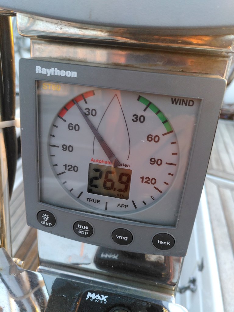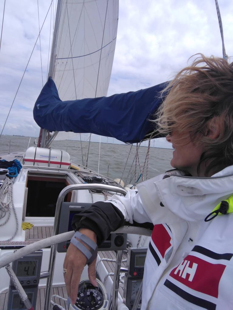 Ondertussen startte onze dag met 20 knopen wind. Aeolus de Windgod had het goed naar zijn zin en zorgde bij ons voor wat stress bij het uitlopen van de haven. Wat is die boot groot en wat vang je een wind ook als je nog geen zeil hebt staan! Het was een tijdje geleden dat wij als short-handed zeilduo op pad waren, maar we lieten ons niet kennen en bleken uiteindelijk ook heel goed achteruit de hele haven uit te kunnen varen.