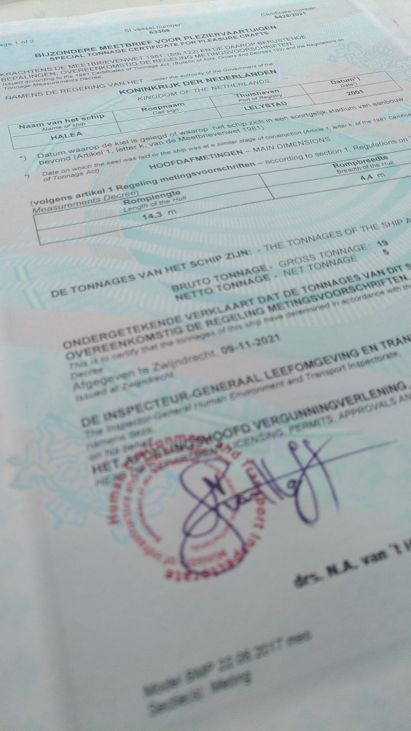 Je zou denken: je koopt een boot, dus je bent de eigenaar. Net als met een auto of een huis. Je hebt een koopcontract en je eigendom wordt kadastraal vastgelegd, of via het kenteken. Automatisch. Zo niet in de maritieme wereld. Het koopcontract was in ons geval goed geregeld bij De Valk Yachtbrokers in Hindeloopen, maar dan ben je er nog niet! Als je ‘zorgenvrij’ buiten de landsgrenzen wilt treden met je scheepje dan begint het pas. En het is natuurlijk niet gratis, want ja… alles wat met watersport te maken heeft is eufemistisch gezegd aan de prijzige kant van het spectrum.