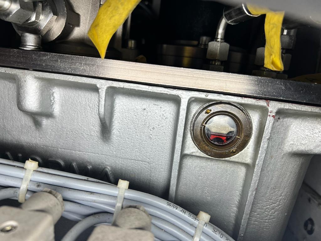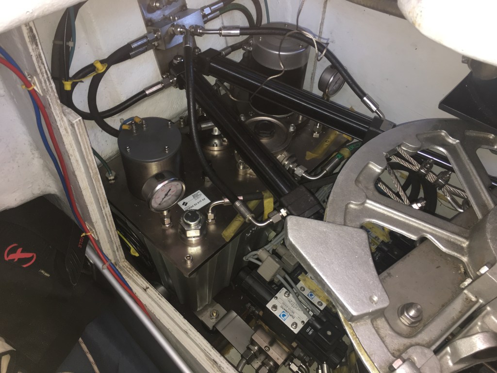 Goed dat we nog op Tenerife zijn, de reparateur kan, als het nodig is, naar ons toe komen rijden, maar… na een dagje rommelen en zoeken lijkt de oorzaak gevonden. In de foto’s zie je een ‘raampje’ met roze vloeistof. Dat was het probleem: de stuurautomaat heeft een eigen oliereservoir (dat wisten we niet!!) en daarin zat niet genoeg hydrauliek-olie. Bijgevuld, testen… het werkt weer! Adem in, adem uit.